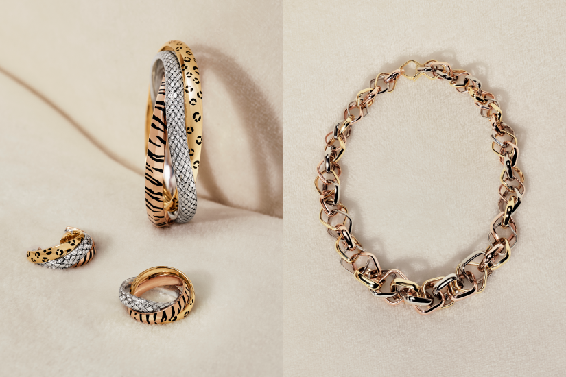 卡地亞除了擁有多個經典系列,更有三位標誌性動物成員,包括美洲豹、老虎和蛇,這次成為 Trinity 系列全新作品的主角,每枚環圈皆點綴動物圖案,白色黃金環圈飾以蛇鱗,黃金和玫瑰金環圈以黑色亮漆勾勒豹紋和虎紋,三者造型各異、魅力無窮,蛇鱗環圈起伏延綿,虎紋環圈呈金字塔形,豹紋環圈則圓潤飽滿。