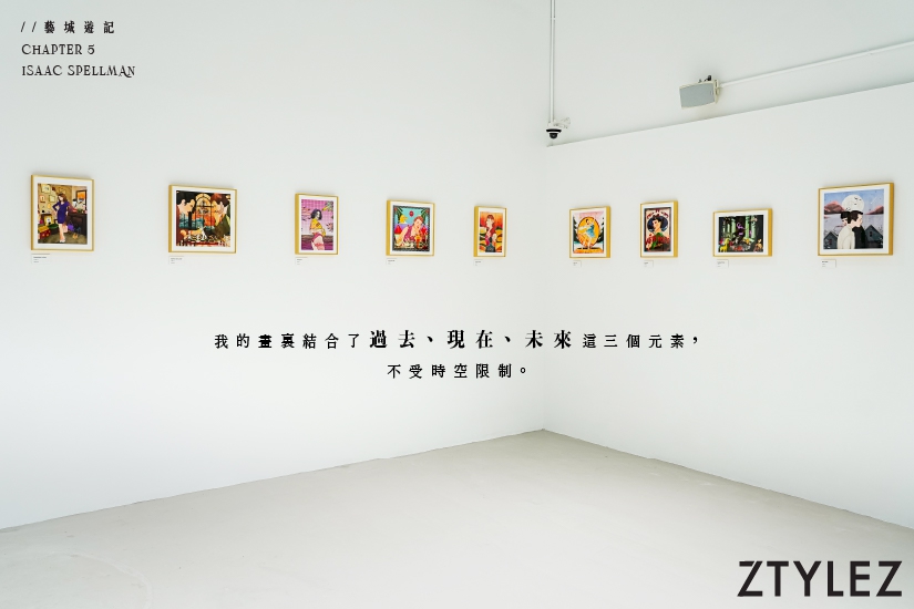 Isaac 憑著別樹一幟的「復古未來風」,將不同時空的素材集合一起,於畫作中復刻不同年代的美學元素,創造出獨一無二的夢幻領域。從 20 年代至未來的事物,都被他收歸作品中。在他創造的世界中,一切璀璨生輝,不存在時空限制,畫面總散發著一股懾人的魔法力量。