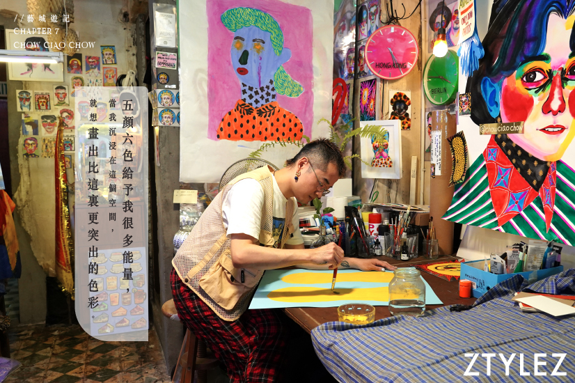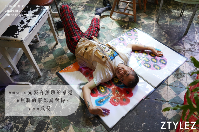 當被問及覺得是個怎樣的創作人,他幾乎沒有半點猶豫地蹦出「自由、隨性」的形容。Chow 坦言自己並非一個有系統地工作的人,因為單純覺得畫畫好玩才畫,比起工作式般繪畫,他覺得自己更像一個自由又即興的畫家。