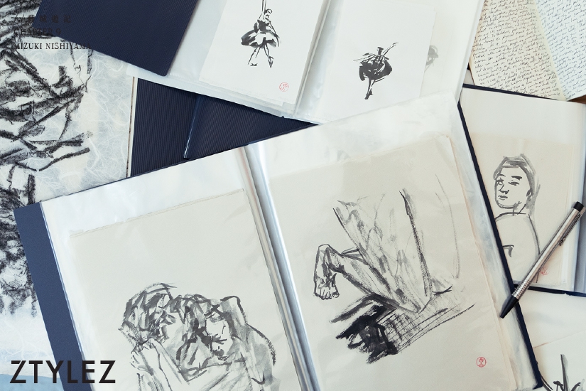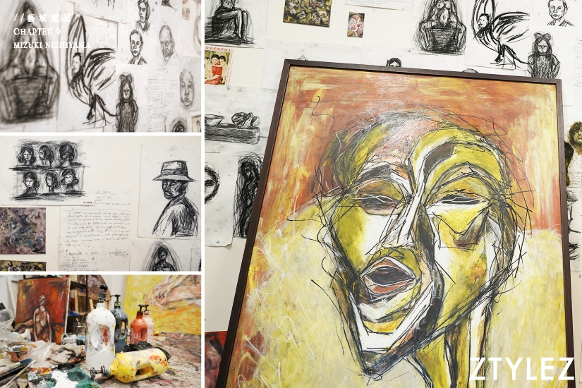 的確,Mizuki 在創作路上一直也在展示不同的面向,除了她最常繪製的表現主義油畫外,她亦有以炭筆、水墨繪畫的人體素描。除了工作室牆上的草稿外,她向我們展示了多個文件夾,當中有她統整得有條不紊的不同水墨系列。除了有她新近的人體作品外,也有她最近以研究「九個人體分解階段」的創作,讓人驚訝她的繪畫題材實在廣泛。
