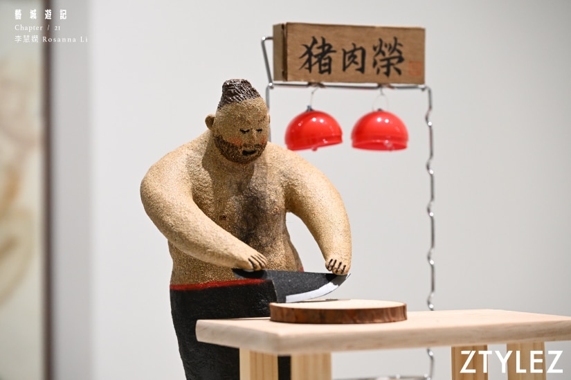 而在這個菜市場中,有些公仔手執公道秤,有些拿起雅枝竹,肉檔老闆則大刀闊斧,殺氣騰騰。它們各人身上的道具各適其適,為造型生色不少,而這些都是歸功於不同的小配件。Rosan 分享:「大家看我的作品就知道配件在我的作品上很重要,如果單純只有陶瓷人物的時候,我覺得有少少單調。我剛才所說它們就是演員,當它們扮演不同腳色的時候,就要有不同的行頭,以及不同的道具在劇場中出現 。」