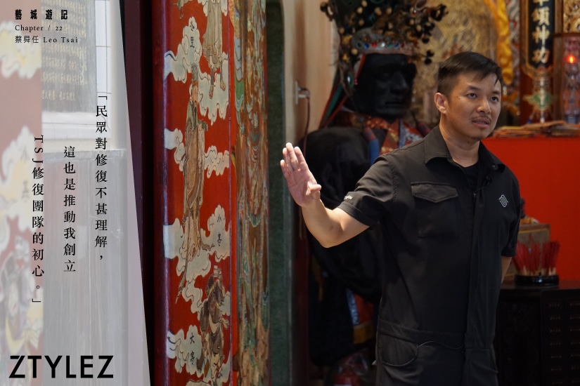 這樣密不透風的工作日程,蔡舜任還創立「百廟門企劃」,修復台灣廟宇的門神,更成為專門修復台灣國寶畫師潘麗水作品的修復團隊。關於這項企劃的誕生,他娓娓道來:「廟宇是一件很複雜的藝術品,或文化資產的結合體。百廟門企劃想讓本土人民重新認識這片土地的”藝術品”,希望可以由我作牽引,推動政府與本地企業合作延伸;並推行到其他國家,深信其他國家也有類似值得保存下來的物件,尤其亞洲;並借此培育台灣的修復人才,沒有比實戰更好的培訓方法。」