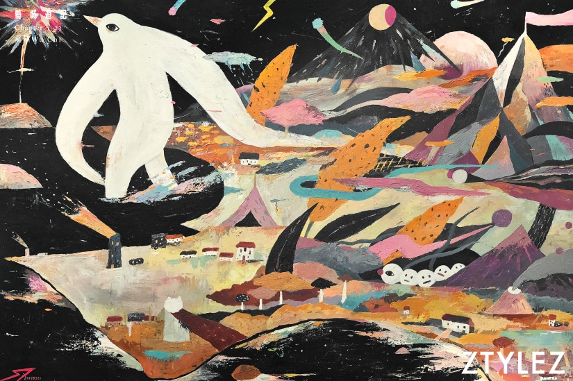 吳騏畫筆下的色調、角色形態萬變,卻都擁有一雙甚至多雙眼睛,活像為他們注入生命,也是他對生活的臆想延伸,他幽默說:「剛開始創作時,我逼自己從生活中觀察,例如看到這座檯燈,就幻想它可能一隻有腳,是會走路的生物。演變後來我也改不了喜歡畫上眼睛的習慣,也許我潛意識希望透過這個轉化將他們變成另外一個世界的事物。」角色不止有生命,亦承載他不同時期的情緒,如鳥人的誕生源自日本國際鳥人錦標賽,當時大學生搖旗吶喊變裝高飛的畫面,教他心生羡慕而創作出鳥人,呈現當下他對自由的追求及頹廢狀態。