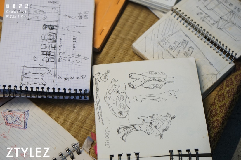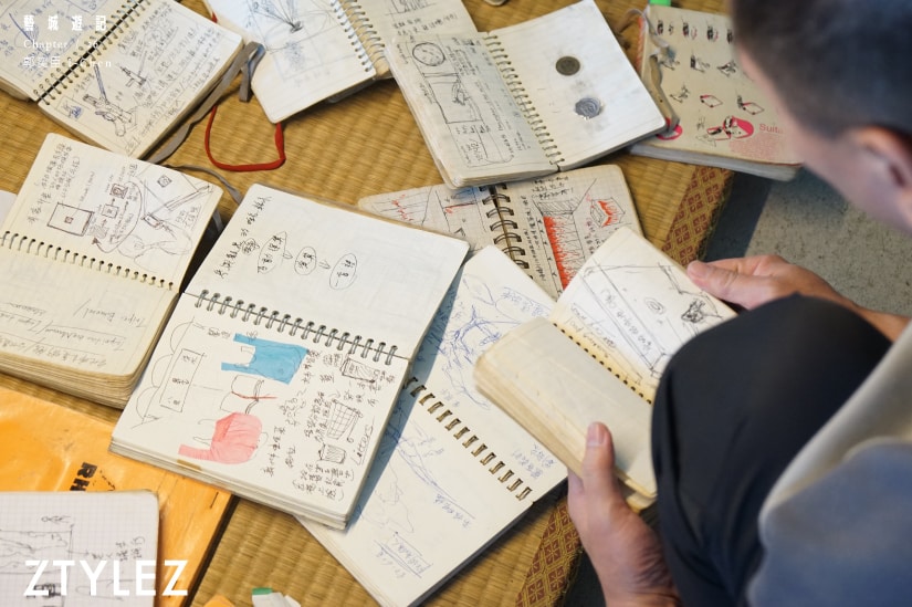 工作室二樓的抽屜,放滿數十本寫得密密麻麻的記事本,翻開裡頭盡是他每個當下的靈感,這些零星片段都會在某個時刻成為偉大的作品,他說:「我每年最少有一本記事本,想到甚麼便畫下來,不時翻看會發現尚有很多可以做的作品,也不急於完成,時間到了作品就會誕生。」對於這位感官敏銳的藝術家來說,最佳的創作狀態是保持好奇,才能洞察不一樣的畫面,他笑說:「我常被說都四十幾歲,怎麼有時候和小孩一樣?創作狀態是永遠像小孩子來看待這個世界,讓好奇心創造出有趣故事,因為藝術創作就是你怎麼去將故事說出來。」難怪工作室二樓的陳架上放滿《玩具總動員》(Toy Story)的玩具。