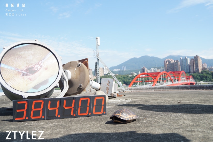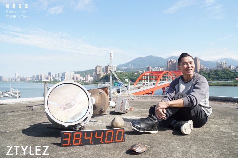 郭奕臣創作的藝術作品形態萬千,運用多種不同媒材。跟隨他沿河岸走一趟,聽他娓娓道來作品的理念,如成名作〈入侵〉運用投影機呈現飛機影子,模糊空間感;〈竹一條河流〉以抽濕機蒐集水分,製成一本冰書。〈圍一道彩虹〉放冰書放在關渡大橋上融化,再回歸淡水河;〈阿斯里斯與月〉借用環境原有的旋轉樓梯觀景台、關渡大橋,呈現人與月球之間的距離。