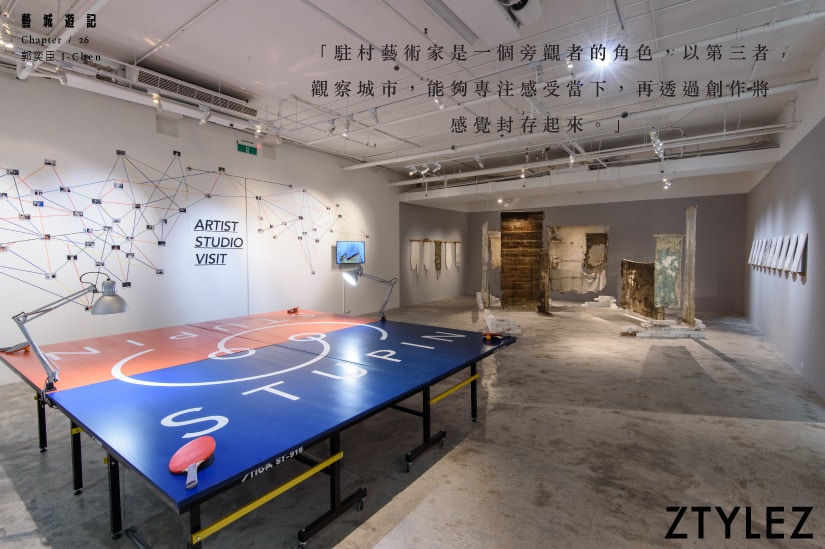 工作室一樓的乒乓球桌象徵了STUPIN的起點,郭奕臣憶述說:「乒乓球桌有很多不同的意涵,既是工作桌、餐桌,是朋友互動交流的遊戲道具,同時也是一件作品,也是駐村平台概念的延伸。將兩張球桌合併在一起,原本只能四人對打,可變成八人同時參與,也是共享的概念。」會延伸出創立嶄新的藝術家駐村平台,源於他過去於多國的駐村經歷,由美國、葡萄牙、英國到法國,駐村經歷為他帶來更多創作能量,他說:「駐村是藝術家至關重要的養分之一!駐村藝術家是一個旁觀者的角色,以第三者觀察城市,能夠專注感受當下,再透過創作將感覺封存起來。這些作品不免偏實驗性,卻能夠帶我往下一個階段。」例如與插畫家林小杯合作的繪本《宇宙掉了一顆牙》,書中的藍色圖案便是他於法國駐村時的藍曬作品。