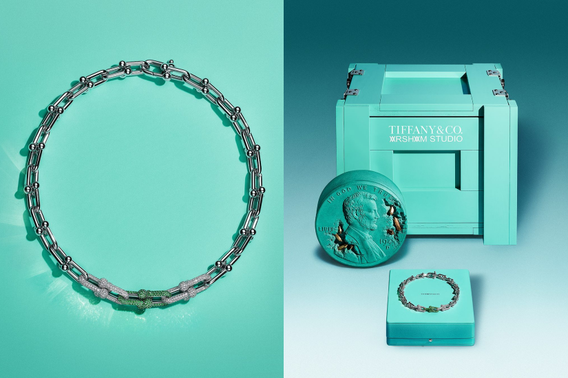 青銅鏽蝕器皿以古銅綠的鏽蝕質感搭配拋光水晶細節,內藏一枚令人驚喜的 Tiffany & Arsham Studio 限量版 HardWear 項鍊 —— 這款以 18K 白金製作的項鍊,鑲嵌超過 1,000 顆鑽石及 500 顆沙弗萊石,彰顯奢華與前衛的設計語言。Daniel Arsham 從 Tiffany 於 1885 年重新設計的美國國徽汲取靈感,將平凡的錢幣升華為幸運與永恆的象徵。