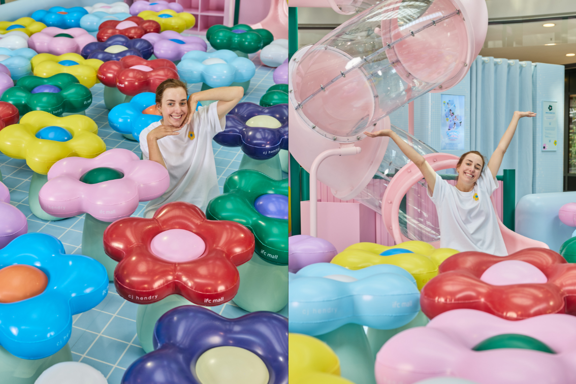 CJ:這次的版本必須因應場地而作出調整 —— 沒有水,也沒開闊的天空,所以我們傾向於垂直佈局的設計,也為 IFC 特別設計了巨型的泳池滑梯,並把花朵變成彈性的充氣裝置,十分有趣。這些細節都是與本地團隊合作的成果,他們是我遇過最棒的解難專家,也是香港特有的版本,也更好、更熱鬧。