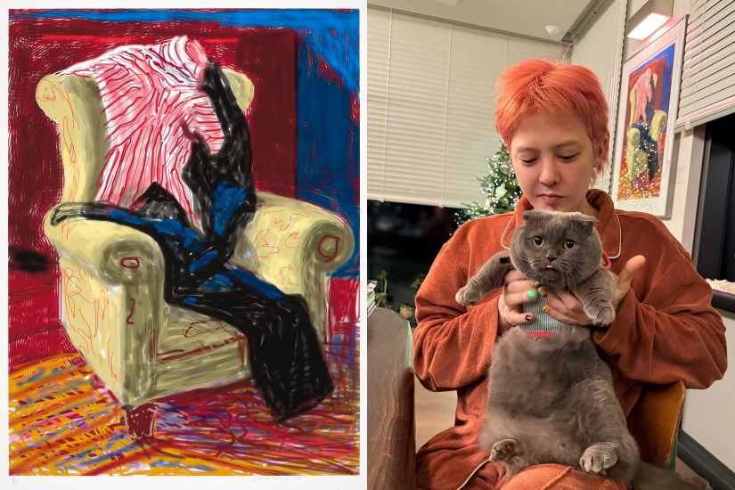 早在 2019 年,美國藝術媒體《ARTnews》就將他與周杰倫同列為「全球 50 位最值得關注的藝術收藏家」,而 GD 的收藏更是橫跨多個領域,從服飾、家具、名車到名畫,其家裡的每個角落都滲透着 GD 的個人審美風格與能力,宛如一座私人博物館。而在 GD 與愛貓 Iye 的合照中,除了私下的居家模樣曝光之外,還無意地發現了被掛在一角的當代藝術巨擘 David Hockney 的《My Shirt and Trousers》(2010)。
