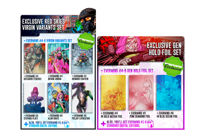 此次集資除首次完整收錄六期故事集外,更推出多款珍稀簽名版,粉絲將有機會獲得由漫畫界標誌性人物設計的限量變體封面,包括 Alan Davis(《Uncanny X-Men》、《Excalibur》)、 Howard Chaykin(《American Flagg!》、《The Shadow》)、Stephen Platt(《Moon Knight》、《Prophet》)、Briane Andan(《Blade Runner 2039》、《Heavy Metal》)、Riccardo Federici(《Batman》、《Superman: Year One》) 及 Peejay Catacutan (《Wolverine: Black, White & Blood》、《X-Force》)等共同創作;更值得一提的是,《EVERMIND》更結合數位科技,與 VeVe 平台合作推出限量版數位收藏品,展現了吳彥祖對新媒體藝術形式的前瞻性探索。