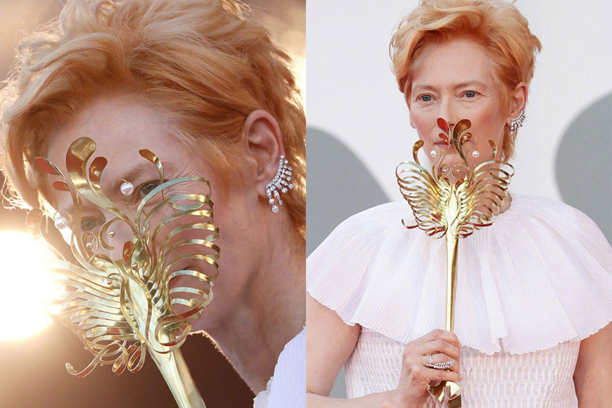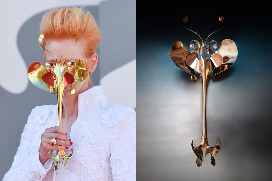 James Merry 為 Tida Swinton 在威尼斯影展設計的面罩就以魚骨、蘭花及海藻為靈感,以金屬及珍珠創作出兩款線條流麗的立體面罩,浮誇外形霸氣莊重,與 Tida Swinton 的崇高地位及空靈氣質相輔相成,成為今年威尼斯影展中最有話題性又最難忘的冠軍造型!
