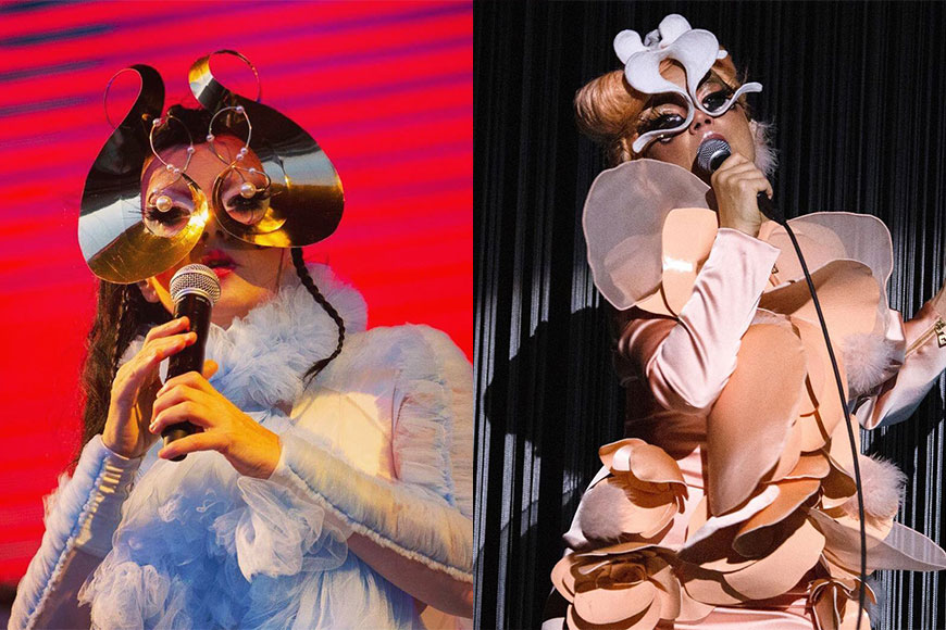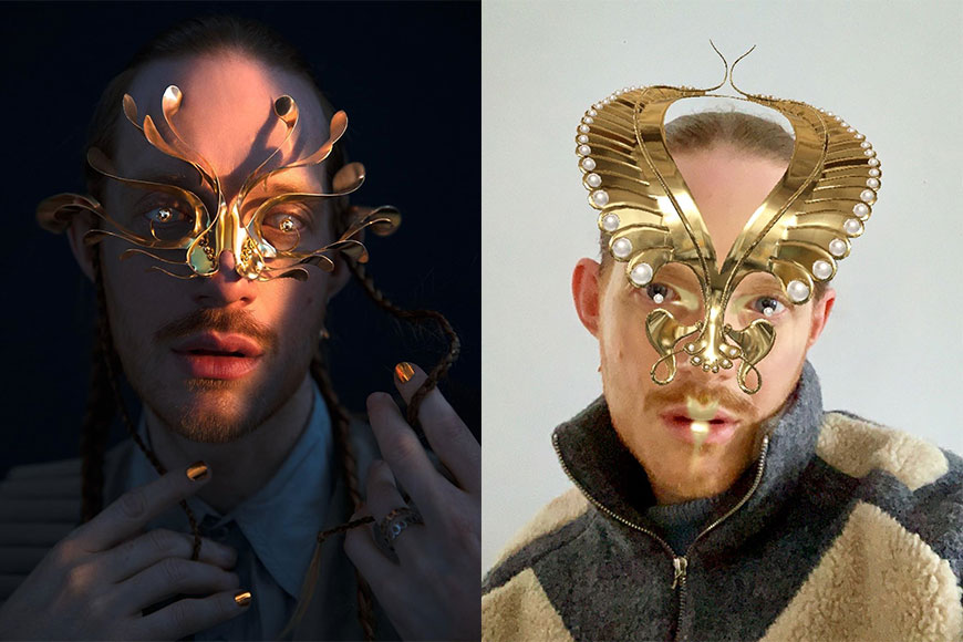 刺繡之外,面罩設計就是 James Merry 最擅長、也最為人所認識的作品!他曾經多次為冰島歌姬 Björk 打造一個又一個充滿神秘感及藝術感的面罩。他的面罩設計天馬行空,從來不受材質特性而規限創意,巧妙地拼配珍珠、金屬、塑膠、刺繡等等的元素,製作出華麗又充滿科幻感的面罩。