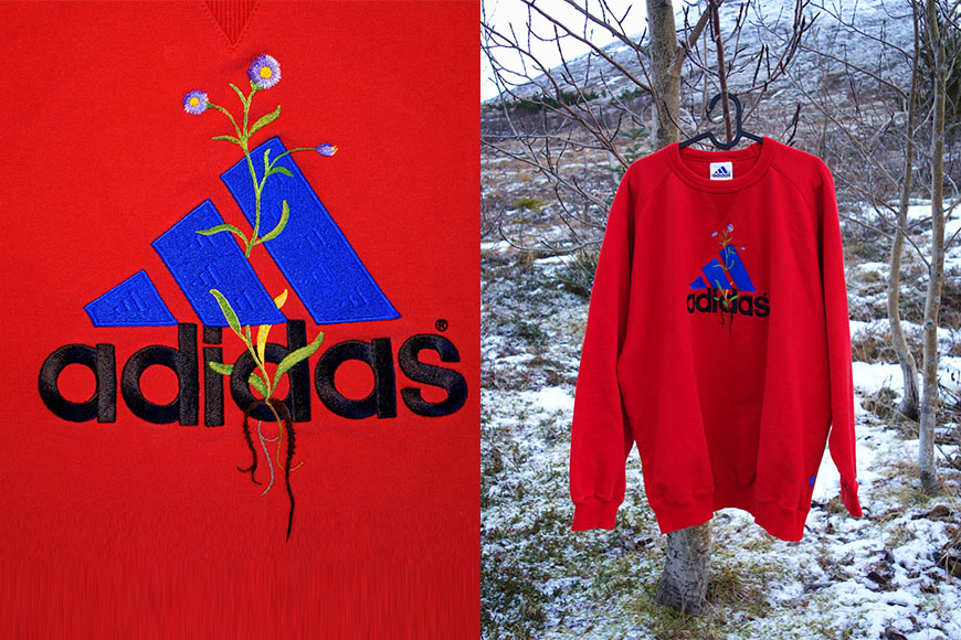 James Merry 的藝術創作大概可以區分為兩大類型,喜愛刺繡的他,不時會把不同品牌的 logo tee 二次創作,在大家熟悉的 logo 上加上大量植物類的刺繡,把商業味濃的成衣改頭換臉,成為充滿小清新質感的作品!