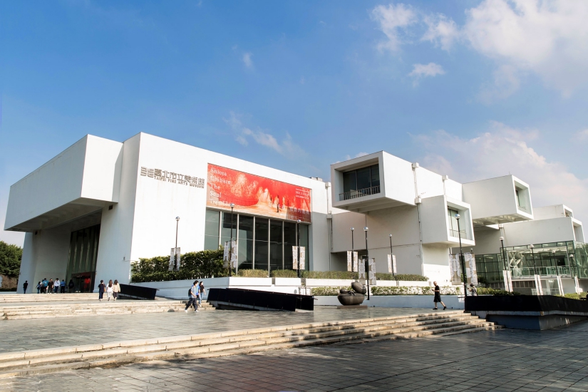 臺北市立美術館建於 1983 年,是全國第一座現當代美術館。這座美術館建築本體十分宏偉,它矗立於花博公園美術園區內,將建築藝術與自然庭園環境相結合。建築物大廳高約 15 米,為 3 層樓挑高,以懸臂飛廊之形式,採「井」字形結體,將傳統建築元素之斗拱堆砌為主體架構,意思是以美術館為文化活水之泉源。四周牆面設計使用整片玻璃採光,中樞內庭承接自然光源,光影隨時間移動而變化,顯現出自然生動的特質!