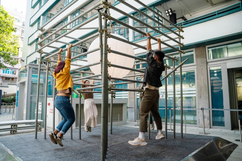 這件實驗性裝置體驗名為「聚力之庭」,團隊以攀石運動最簡單亦最常用的「垂吊」練習方式,讓 來者參與肌力與耐力的挑戰,同時了解自身與攀石愛好者及專業運動員體能 上的分別。團隊希望以藉著這一個簡單的挑戰,令大眾發掘更多身體「有 用」的地方,測試「同行」與「鼓勵」對自我表現的「有用」與「冇用」之 處。