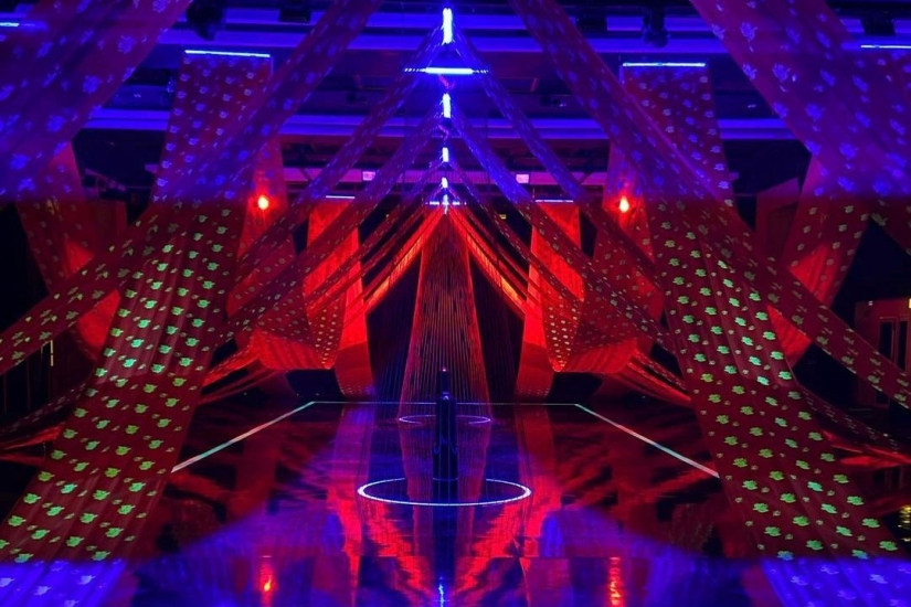 日英投機主義設計師 Sputniko! 與生物科技研究工作室合作,透過轉基因技術產出如神話中的紅色絲線,其中蘊含愛情荷爾蒙——「催產素」。今年更伙拍香港建築設計團隊 Napp Studio & Architects,將紅線編成長布,縈繞交疊成為一座由亙古情感 搭建而成的愛情神社。神社作為一個信仰與願望、情感和目的交織的場所,大家可 以在月光般的燈光設定之中,欣賞由京都布藝師製作的曇花圖案,在浪漫的月老神話背後,反思社交距離下情感和牽絆的意義。