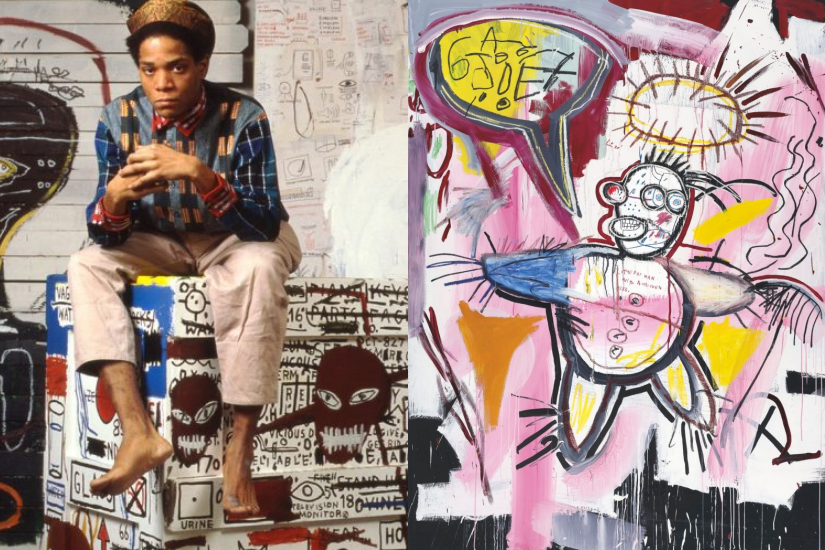 創作於 1982 年的《Donut 復仇》近兩米四高,正是標誌著巴斯奇亞藝術生涯 巔峰時期的里程碑式宏偉鉅作。畫作背景佈滿燦爛和煦的粉色、白色、黑色、 黃色、紅色筆觸,一位如天使般飄浮其間。他頭頂上的光輪閃閃發光,閃耀著輝煌奪目的火光,另一側,一個巨大的對話框內則出現了一些難以辨認的黑色潦草字跡。這些元素凸顯了人物的視覺張力,既與漫畫和卡通有著異曲同工之 妙,又可溯源至抽象表現主義和古典大師傳統。