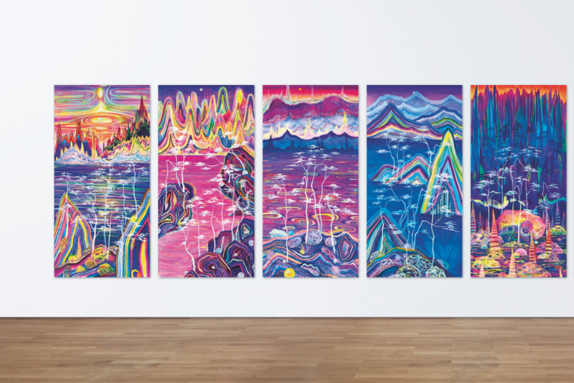 2016 至2019 年這四年間, 黃宇興創作出驚世的七屏巨作《七寶松圖》。畫面以璀璨奪目的寶石色調,堆砌出一個光芒四射的藝術境界。每幅畫作中所描繪的景緻令人憶起自然中的壯麗風光,但另一方面,迷幻的用色與躍動的光彩,又猶如魅影般震懾觀者心靈。深受藏傳佛教影響的黃宇興,正以佛教中寓意吉祥的「七寶石」為題,探討宇宙洪荒背後無盡的力量。