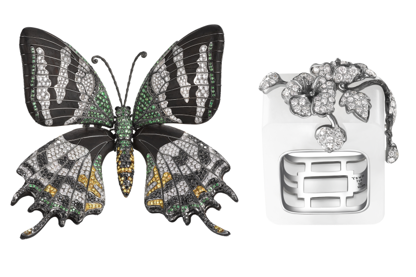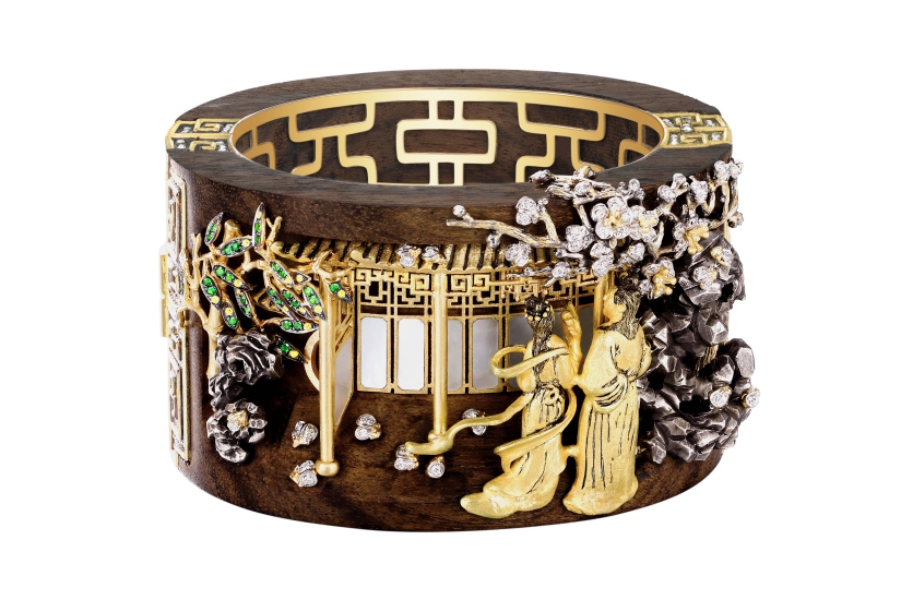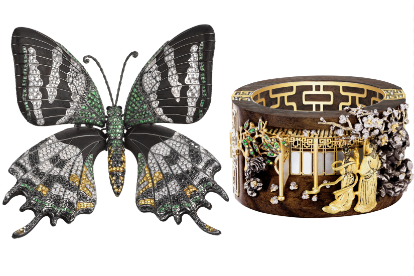 在翁狄森捐贈珠寶中,其中兩件為傳世收藏級作品,包括「莊周夢蝶」慈善系列之中國國蝶(金斑喙鳳蝶)酸枝木配鑽石及寶石胸針,以及「文人話」系列之紅樓夢(桃花戲語)黑胡桃木配鑽石及寶石黃金手鐲,手鐲靈感來自於紅樓夢第 23 回《西廂記妙詞通戲語、牡丹亭艷曲警芳心》。