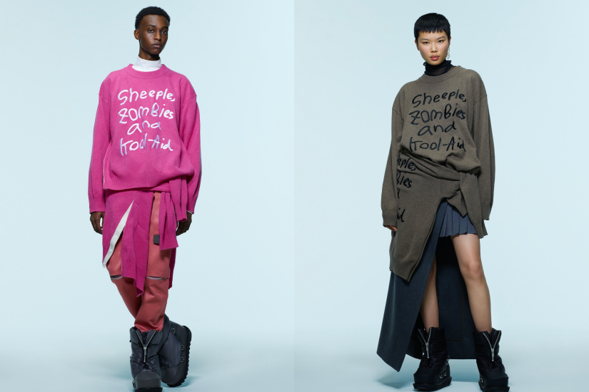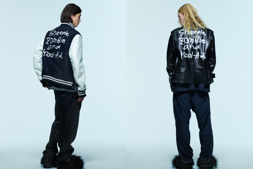 MADSAKI 以通過引用俚語、電影和漫畫人物來批判大眾文化而聞名,他使用噴漆作為美術媒介,開發了一種標誌性風格。Sacai FW22 季度邀請大師合作,推出一系列服裝上裝飾著「Sheeple Zombies」和「Kool-Aid」的噴漆字句子,印在夾克及運動衞衣上。