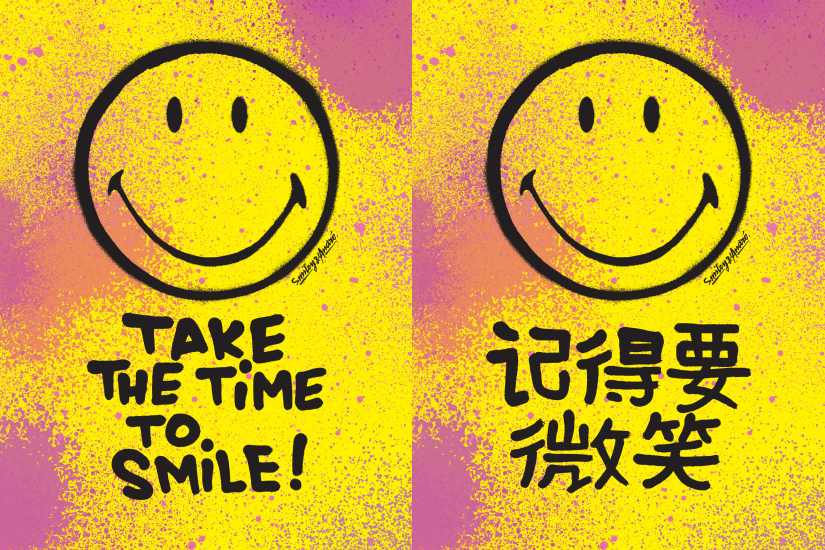 如今他筆下樂觀又活潑的「Mr. A」碰上充滿活力的 Smiley,藝術家笑言就是兩兄弟!Saraiva 在這企劃設計了不同語言的 Smiley 海報,並在這兩個月時裝週期間,張貼在主要城市的街道上,繼續傳播微笑和正能量。