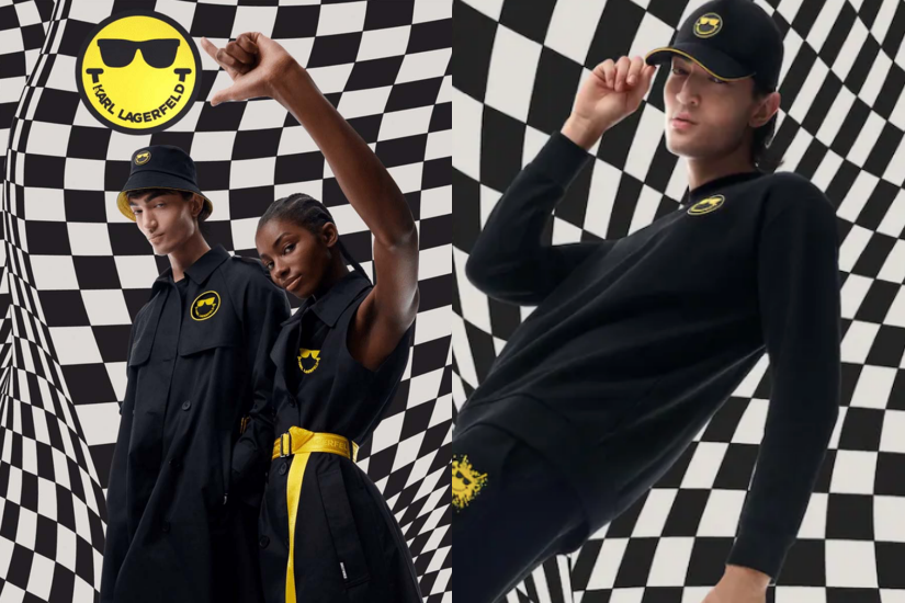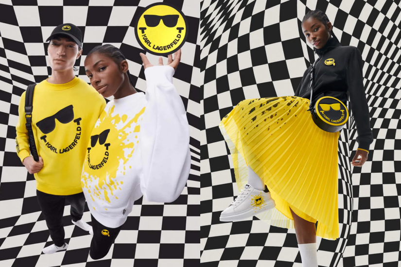 永恆的笑臉圖標烙印在「老佛爺」無處不在的太陽鏡上,某些款式還採用了 Karl 無處不在的馬尾辮,賦予了品牌一種俏皮形象。這系列選擇使用引人注目的黃色、黑色和白色混合色調,設計出時尚的風衣、亮麗的百褶裙、牛仔褲、連帽衫等等。這系列專注於高級運動休閒,還包含中性慢跑褲、運動衫、T-shirt 和各種配飾。此外,大部分款式是用對環境影響更小的更可持續的材料製作的,這絕對值得大家一笑。