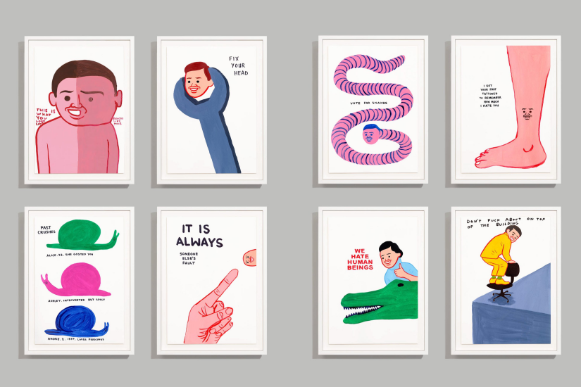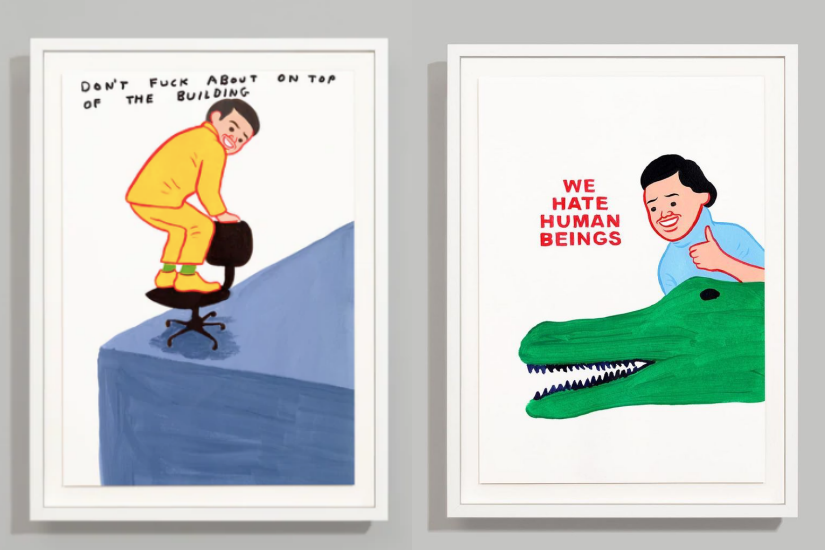 Shrigley 的作品以簡單線條勾勒事物,比較重視形式上的表達,範圍涵蓋繪畫、雕塑、裝置藝術和攝影。而 Cornellà 就喜歡用豐富的顏色表現他筆下的標誌性人物,創作出諸多引人大笑的插畫故事。