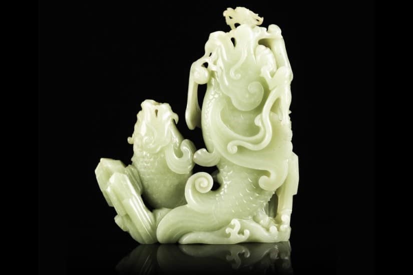 另一件吸引全球各地收藏家爭相競拍的中國古董是一件舉世矚目的中國雙層雙頭軟玉玉瓶,兩邊各有一條從水中躍起的中國龍鯉形狀,右邊較高的鯉魚高20cm,伴隨著一條龍。