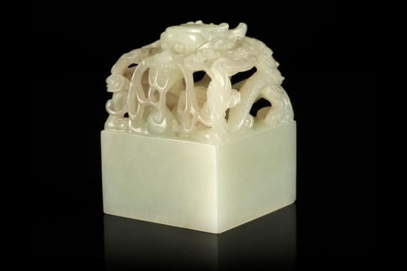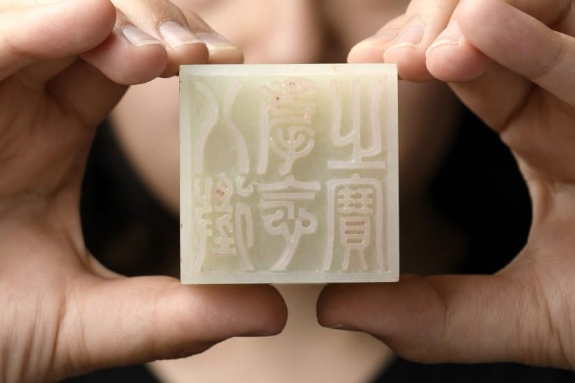 而在眾多展拍的藝術品當中,最為吸引的莫過於一件方型軟玉玉璽,其長闊為5×5 cm,高度為6.5cm。玉璽的顏色為淡綠白色,並有淡淡的紋路,彰顯玉石的美態,而玉璽的上方為一條神龍在雲中手握龍珠的形狀,而玉璽底下則刻有銘文「八徵耄念之寶」。