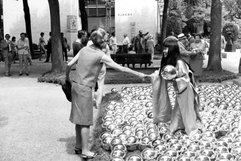1966 年,草間彌生在沒有任何邀請的情況下,帶著自己的 1500 個鏡球來到威尼斯藝術雙年展展館外,展出她的《那克索斯的花園》。她以數美元的價格在場館外售賣自己的作品,才賣出幾個便被主辦方出來制止。這次活動讓草間名聲大噪,紐約 MoMa 等藝術館更邀請她展示前衛的即興行為藝術表演。漸漸地,她的名字開始被藝術圈重視。