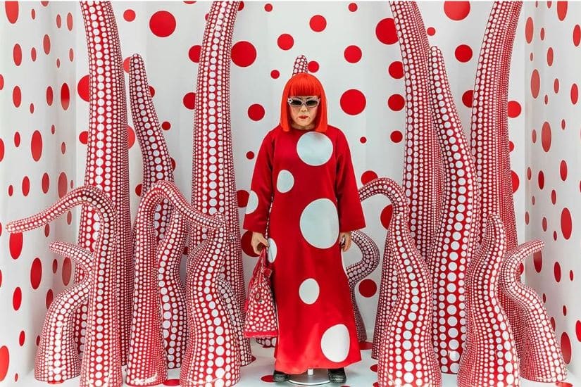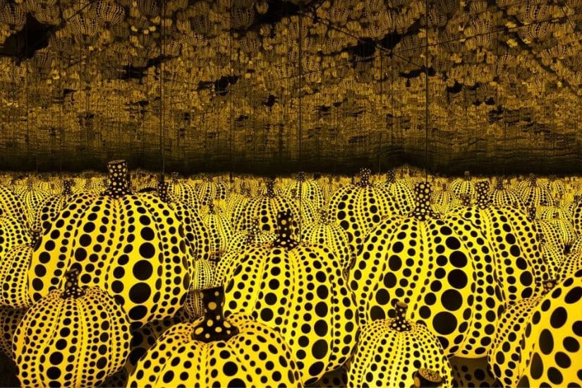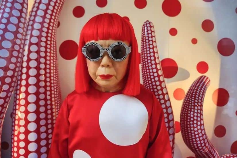舉世知名的日本當代藝術家草間彌生(Yayoi Kusama)於 1929 年出生在日本松本市,她以廣泛的圓點圖案和無限裝置而聞名。圓點主題源於草間彌生幼年受精神疾病困擾,她的世界被各種密集式圖案包圍,她形容那種感覺彷彿掉進一個無垠空間之中旋轉不休。後來,她將纏繞自己多年的困擾化為創作元素,以繪畫舒緩病徵,直視幻覺給她帶來的痛苦。