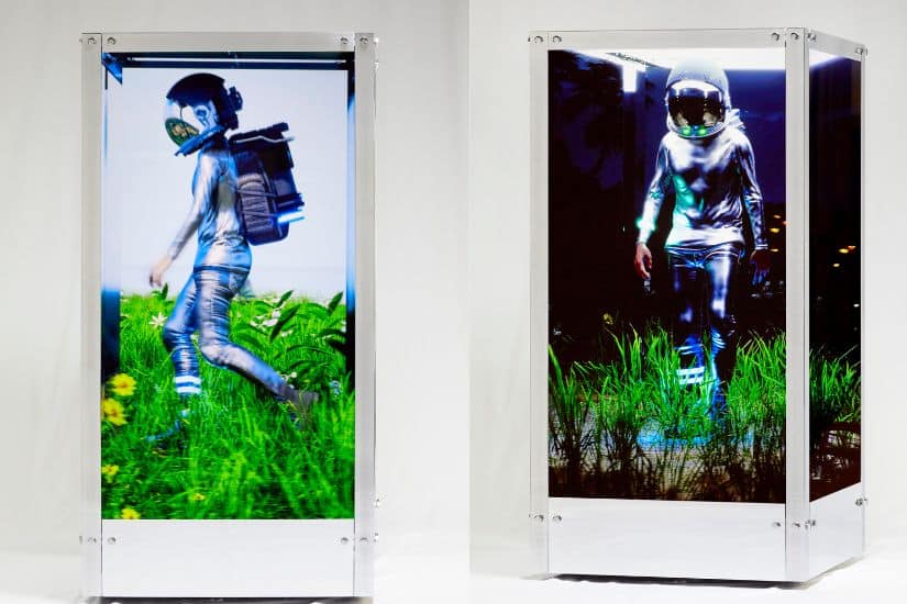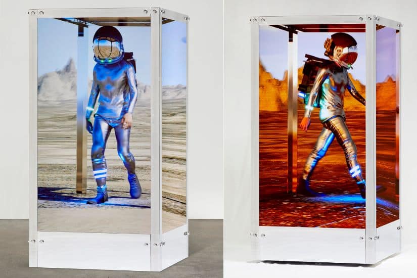 左:Beeple《人類一號》,2021 年 四頻道數碼錄像雕塑(彩色、無聲),拋光鋁及桃 花心木支架 動態非同質化代幣。鳴謝Ryan Zurrer’s personal collection
