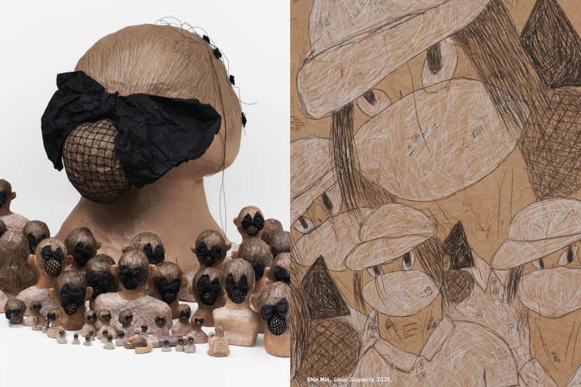 申旻說,每個角色都有其名字,而其掙擰、不滿的表情亦暗示了韓國女性的掙扎和壓抑,而這些無從表達、改變的社會狀態,透過層層疊加的紙張創作和富有張力的注視,一一揭示了性別、階級與勞動之間的複雜關係。