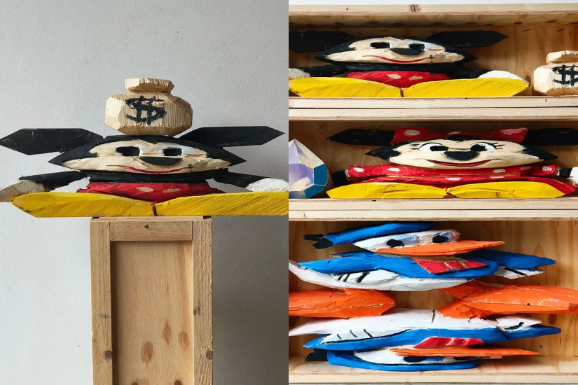 而近日,他就把 Mickey Mouse、 Donald Duck 等經典角色「變型」—— 那熟悉的紅色蝴蝶結 、黃色鞋子和表情,都通通壓縮了起來,還塞進狹小的木箱內,看起來既可愛又有點怪異,又充滿了被擠壓的荒謬感,一步挑戰了觀眾的感知極限。
