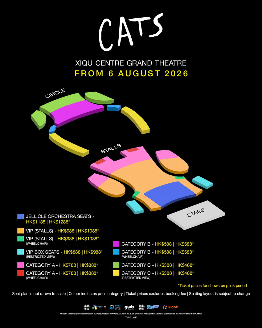 繁忙時段為星期五晚上、星期六下午及晚上,以及星期日下午場。該時段票價為HKD 1,288(Jellicle樂池席)、HKD 1,088(VIP正廳)、HKD 988(VIP包廂)、HKD 888(A區)、HKD 688(B區)及HKD 488(C區)。