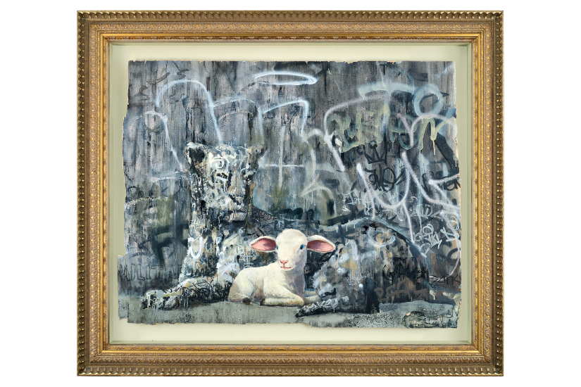《獵豹與羊》(The Leopard and Lamb)是屬於向來以顛覆常規的匿名街頭藝術創作者 Banksy 的作品,此作也曾於伯利恆(Bethlehem)的一家特色藝術旅店「圍牆飯店」(The Walled Off Hotel)開業之時展出。作品中的一隻豹與一隻羔羊和平地躺在一起,呼應了《聖經》以賽亞書 11 章 6 節的預言:「豹狼必與綿羊羔同居,豹子必與山羊羔同臥。」這一視覺隱喻不僅拓寬了聖經中關於與 生俱來的敵人和諧共存的想像,並且微妙地批判了戰爭與衝突,呼籲人們就關於和平的普世希望進行反思。