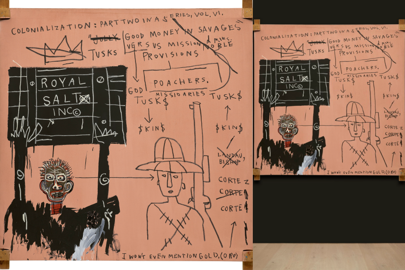 《亞摩利人獵遊》(NATIVE CARRYING GUNS + BIBLES AMORITES ON SAFARI)創作於 1982 年,是 Basquiat 最具代表性的畫作之一。畫中融合了 Basquiat 擅長的豐富符號、粗獷筆觸和大膽色彩,呈現出一場混亂而動感的「獵遊」場景。Basquiat 曾表示,這件作品反映了他對於社會不公和文化邊緣化的憂慮。它代表了他對身份認同、偏見和種族關係的批判性探索,成為 Basquiat 藝術語言的重要里程碑。此次富藝斯在香港呈獻這件精品,無疑為亞洲藏家和觀眾帶來了一次難得一睹 Basquiat 巔峰創作的機會!
