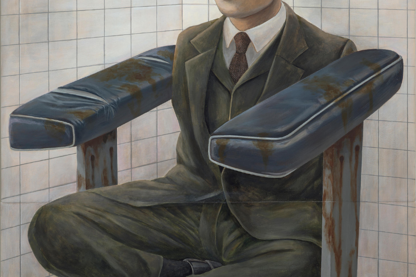 這幅尺寸為 145.6 x 103 厘米的壓克力木板作品中,一位經理盤腿坐著,雙臂與金屬支架緊密融合成一張破舊椅子,椅背成為其脊椎的延伸,座椅則取代了下半身;他的表情呆滯,眼神空洞,身上的西裝依然整潔,完美捕捉了職場階級下表面光鮮但內心麻木的現代人處境。