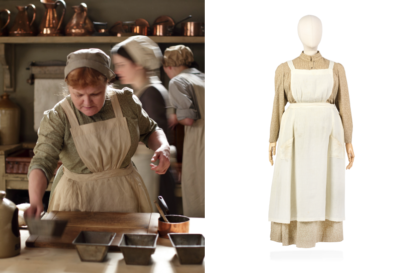 另一亮點是 Jessica Brown Findlay 飾演西比爾小姐的哈倫褲戲服(估價 3,000-5,000 英鎊)。這套在第一季第四集出現的服裝,象徵著西比爾前衛的政治理念與對女性解放的支持,也預示了女權運動對貴族社會帶來的衝擊;同樣引人矚目的還有 Lily James 所飾演的羅絲小姐,她在出席「元媛舞會」時所穿的奢華禮服(估價 800-1,200 英鎊),這場重要的社交活動標誌著年輕貴族女性正式進入社會;以及一系列僕人制服、料理區的圍裙,在細節如繡花與布料選擇上,悠遊於功能與審美之間,能溫柔呈現下層人物的勞動光景。
