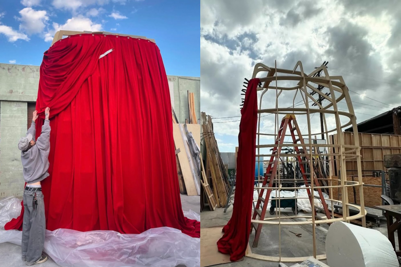 事實上,這色套紅色的巨型禮服是以 270 米的特製防火舞台布幕為主要材質,而內部則以 7 個木製框架為基礎結構,並配合鋼鐵籠架支撐,確保龐大的布料量能完美展現層次感,製作過程如同建築工程。