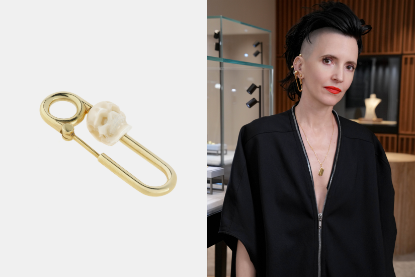 相較之下,狗牌釘耳環則更為精巧,以藍寶石鑲邊的細節為特色,並可搭配「A Vanitas」黃金珍珠安全別針耳環,增添華麗氣派。