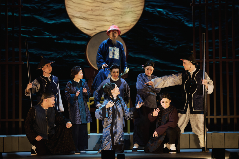 另一場尤其出色的,必定是阿細跌入水中的場景和情感轉折處的呈現,也是整個故事的轉捩點。Jonathan 分享:「為了呈現水中的感覺,我們運用了多種技術,如特殊的投影,去創造出水波紋的效果,還設計了一組特殊的藍綠色調的燈光,從不同角度照射營造出水下的氛圍,以及煙霧效果、特殊材質的布幕,當光線穿透時,能夠模擬出水的流動感。這不僅是表現物理上的水中環境,更要傳達角色此時的心理狀態、動作和音樂的節奏 —— 所以,當演員唱歌時,燈光會亦隨著音樂的起伏而變化,再配合旋轉舞台,打造出一種彷彿被水流沖刷、包圍的感覺。」