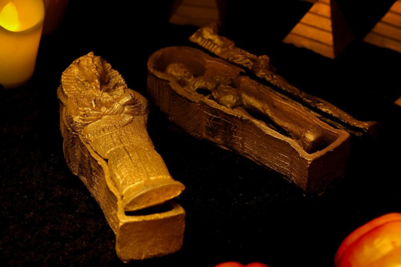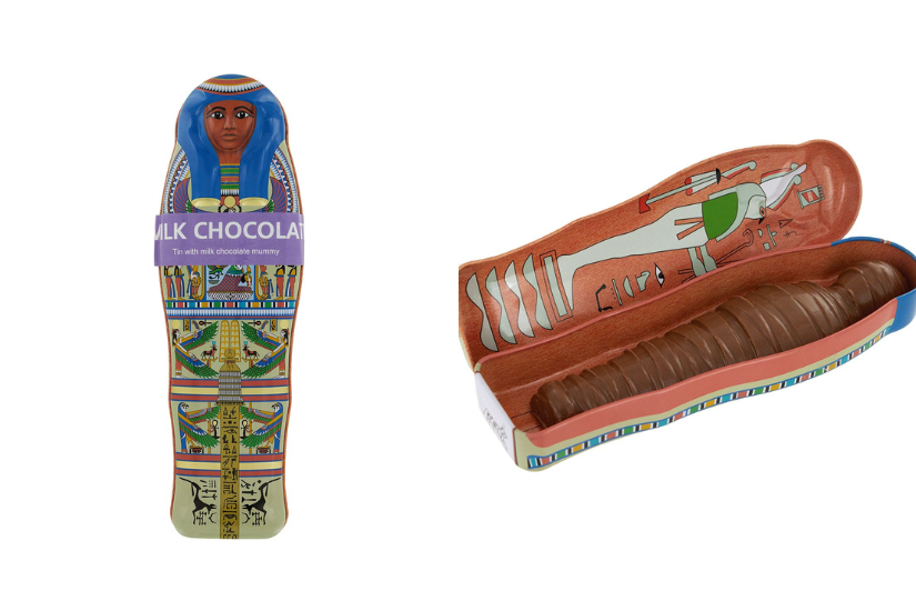 大英博物館獨家販售的古埃及木乃伊鐵盒裡的純牛奶巧克力,確是趣味十足 —— 以包覆繃帶的木乃伊為造型,並裝在一個色彩鮮豔的鐵盒裡;盒子的形狀仿照埃及木乃伊棺槨,上面裝飾著古埃及神祇、符號和象形文字,其靈感源自埃及第二十二王朝一位名叫內斯佩倫努布的男子的木乃伊棺槨。