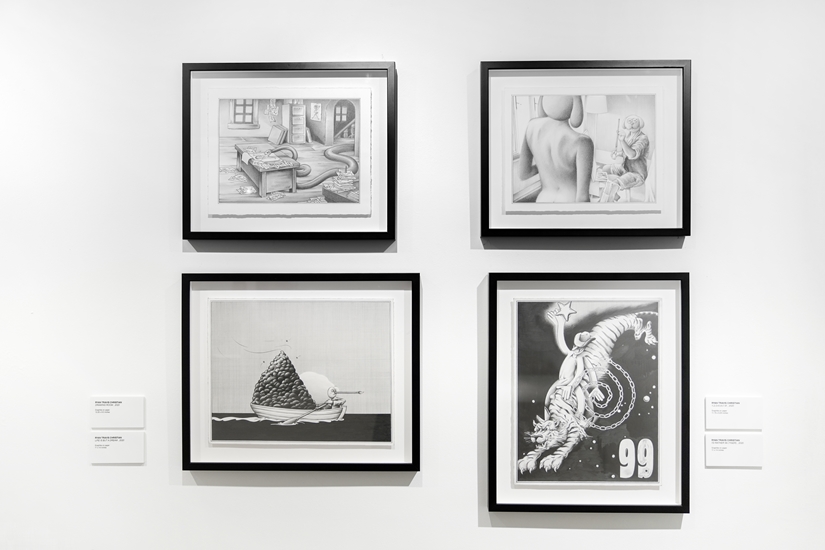Ryan Travis Christian 曾被 DAZED 評選為「十大使用單色藝術家」之一,作品主要為以黑、白、灰色調建構出的石墨繪畫。由於生於美國戰後時代,經歷過荒謬的童年,所以他的作品都富具超現實主義的風格;另外她亦受芝加哥具象風格影響,作品既有充滿童真的卡通元素,但又帶有暗黑不祥的氛圍,以揭示當代的亂象,本次作品亦如是。