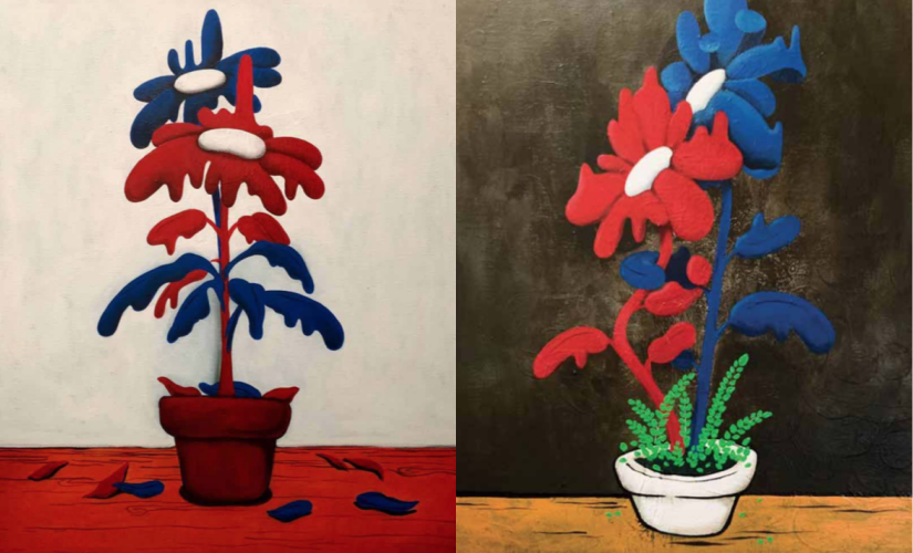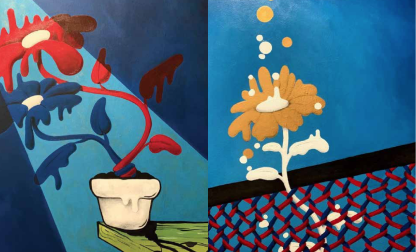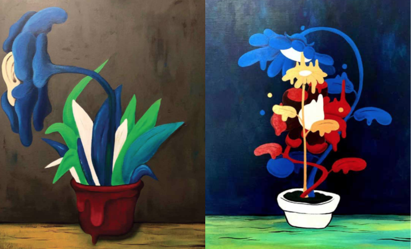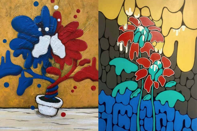 有別於上一個個展的創作,畫布上的主角不再是那些家傳戶曉的卡通人物,而是充滿生命力的花卉植物。這次展出的作品最大特色是中西元素兼容,畫面的構圖恰似傳統中國畫對花卉的描繪,然而藝術家以比較概念性的筆法去表現出花卉蓬勃的生機,並用以比喻人際關係。它們被放置在不同場域,展現出盛放、凋謝、嫁接等狀態,猶如向觀眾展示了一場生命的循環!