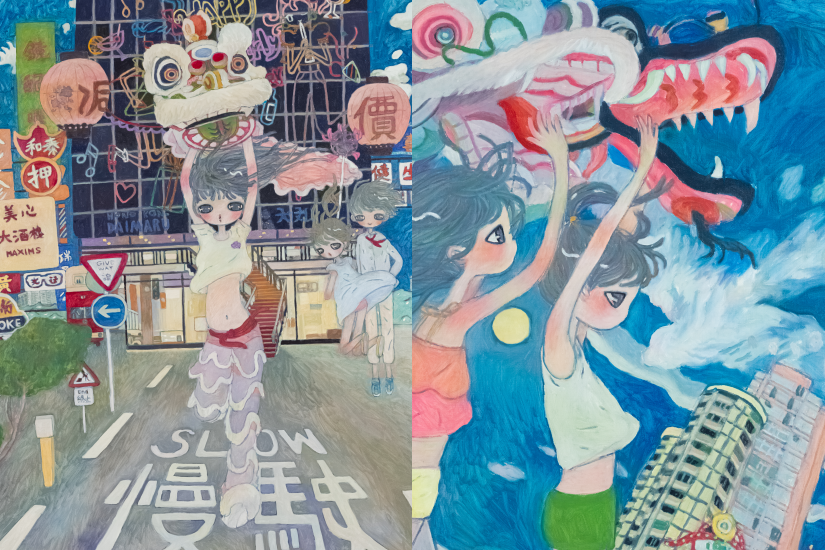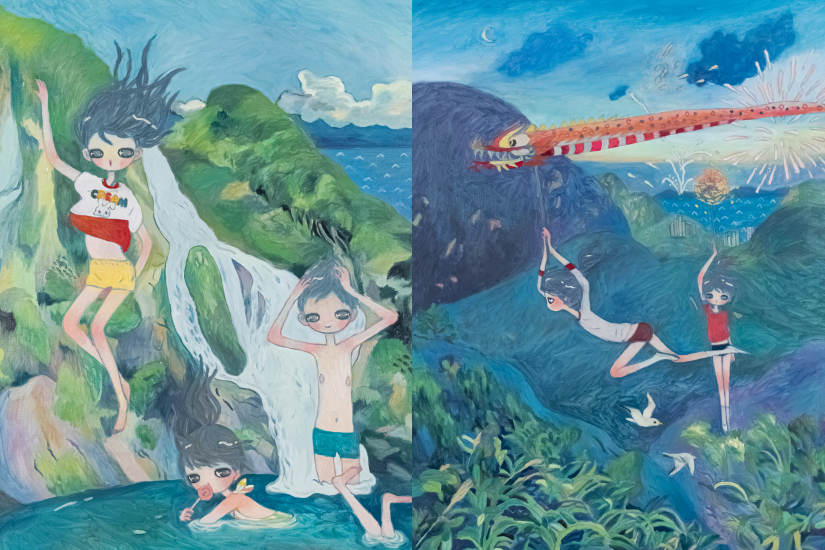 作為村上隆的弟子,超扁平風格一直是高野綾創作的鮮明特色。她筆下的人物天真爛漫、充滿活力地遊走於城市與大自然之間,展示了香港獨特的地理特色。疫情下到郊外行山成為我們的生活常態,高野綾便將山明水秀的怡人景色繪於畫布上,以柔和的筆觸將香港翠綠的山間與清澈流水紀錄下來。