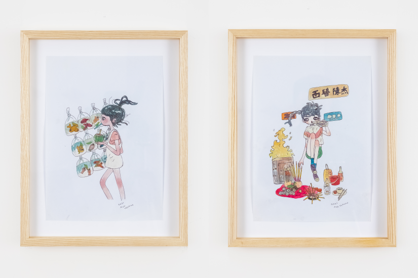 右:高野綾 《 august, hungry ghost festival 》 2021 紙上鋼筆及水彩 連框: 38.2 x 29.5 x 3.8 cm