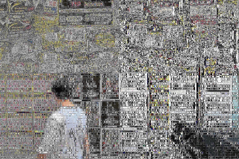 作為 90 後的梁洛熙,過往的創作主要以社會議題、本土文化、集體回憶、城市發展為題。他喜愛收集一些生活中的小物來創作,其以硬幣砌成香港風景的畫作最為人熟悉。今次展出的作品化繁為簡,但意義同樣深遠。他重複將彩色照片上載至社交網絡再下載,圖片的影像訊號在過程不停損耗,最後形成這幅剩下黑白噪點的圖像。這系列的作品反映出資訊氾濫的網絡中,事實與記憶都逐漸變得模糊。