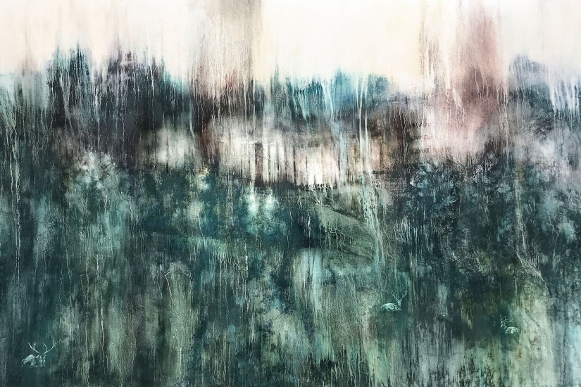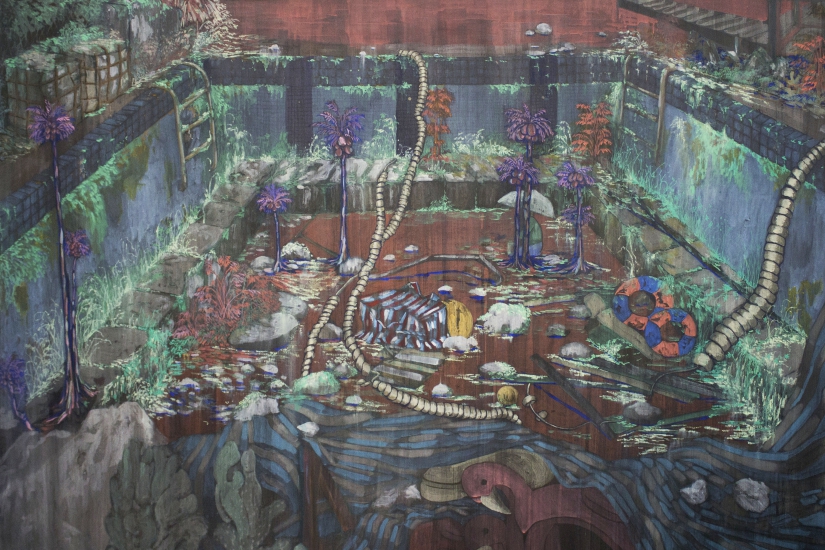 黃詩慧的《砂堡》展示了一片廢墟,她將荒廢之地視為記憶和歷史的載體,從中發掘那些鮮為人知的事蹟。這片狼籍下,讓人想起那些逐漸消逝的城市一隅。藝術家在這幅作品上運用了水墨、水性顏料、彩色顏料、黏土等多種媒材,通過重複繪畫與沖洗的過程,寓意記憶與歷史都一直被人更改,甚至消除。