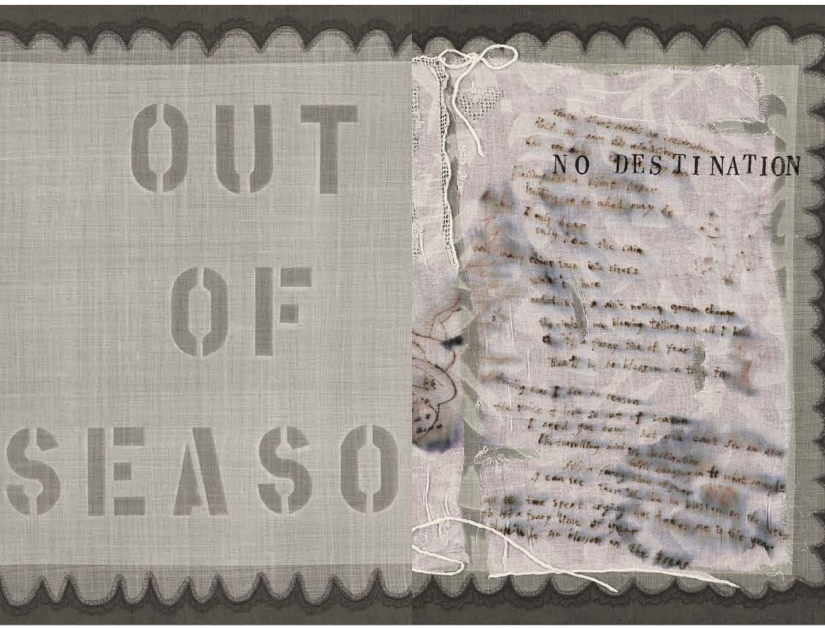 作品《不合時》來自區凱琳的《時間釋義》系列,她以手帕與麻布作媒材,通過手藝來表達對時間流逝的感觸。畫中的文字出自音樂人 Beth Gibbons 2002 年專輯 《Out of Season》中的一曲 “Funny Time of Year”。躺佯在時間的慢流中,藝術家將期盼美好結局的心情寄託於作品中。